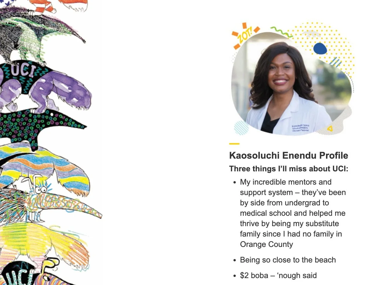 Media Features Op-Eds and News Articles Lectures, Presentations, and Videos "I want to partner with patients and provide care with an anti-racism lens... And give other doctors the tools to do the same." Kaosoluchi Enendu, MD, MBA for UCI’s Special Report